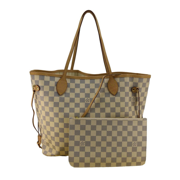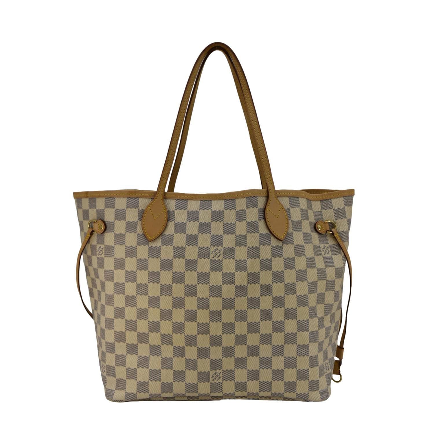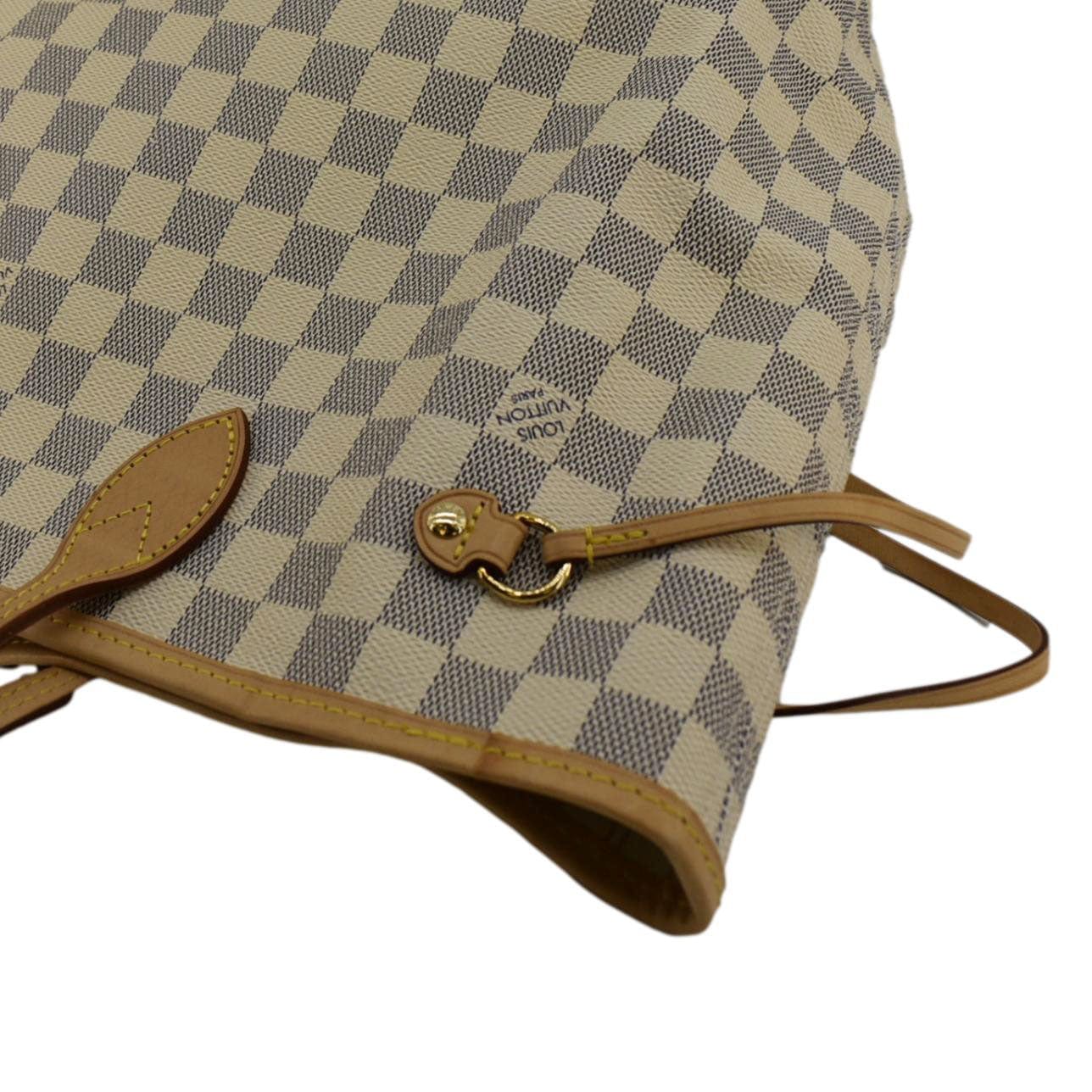 The Louis Vuitton Neverfull MM in Damier Azur is a stylish, spacious tote with a white checkerboard pattern, ideal for everyday use. Its leather trim and classic design add a touch of elegance to any outfit.