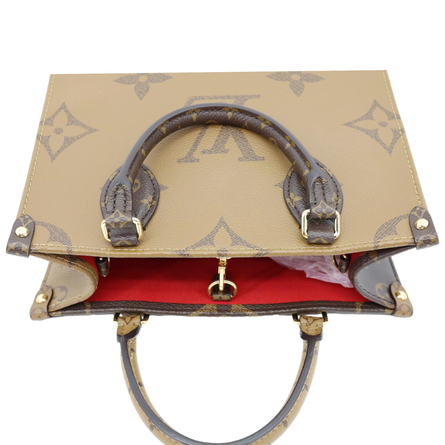 The LOUIS VUITTON Onthego PM in Giant Monogram Reverse canvas showcases bold monogram patterns with dual top handles and a removable strap. Compact yet striking, it's perfect for both hand and shoulder carry.