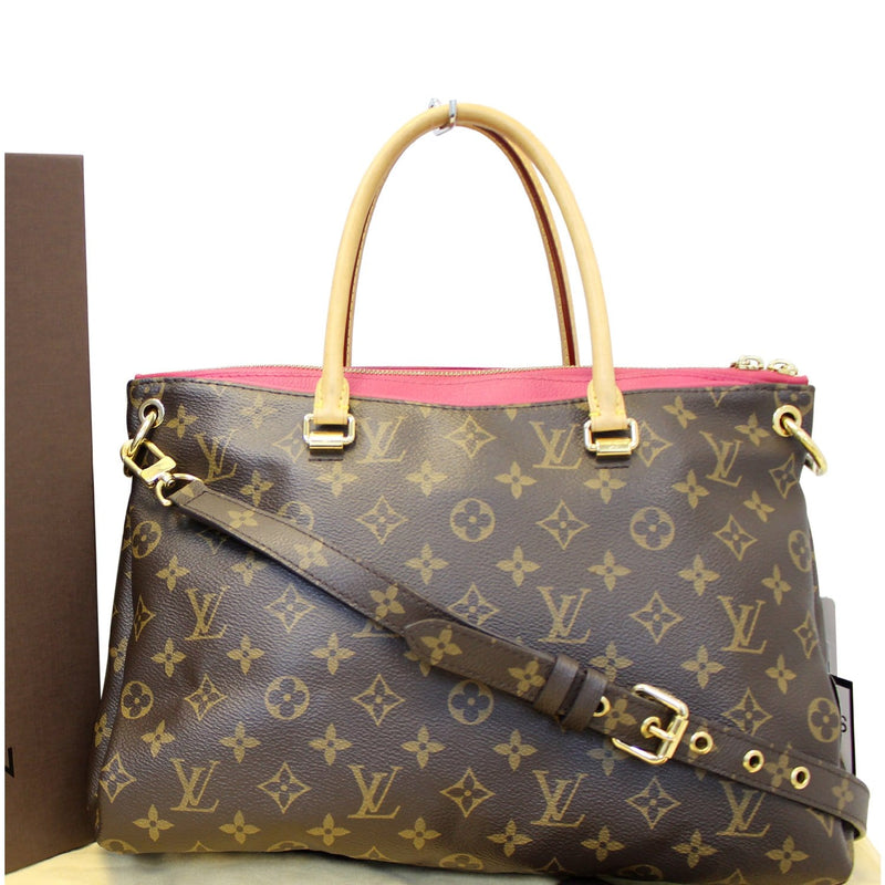LOUIS VUITTON Pallas Monogram Canvas 2Way Shoulder Bag Cerise. One of the newer creations from the house of Louis Vuitton, the Pallas is a chic combination of Monogram canvas, natural cowhide leather trim, and colored calf leather.