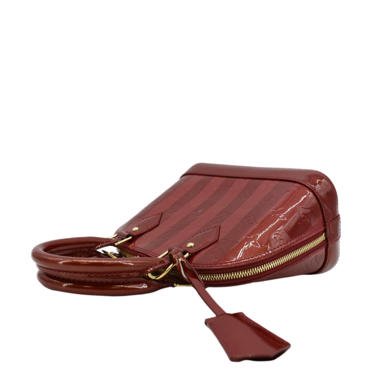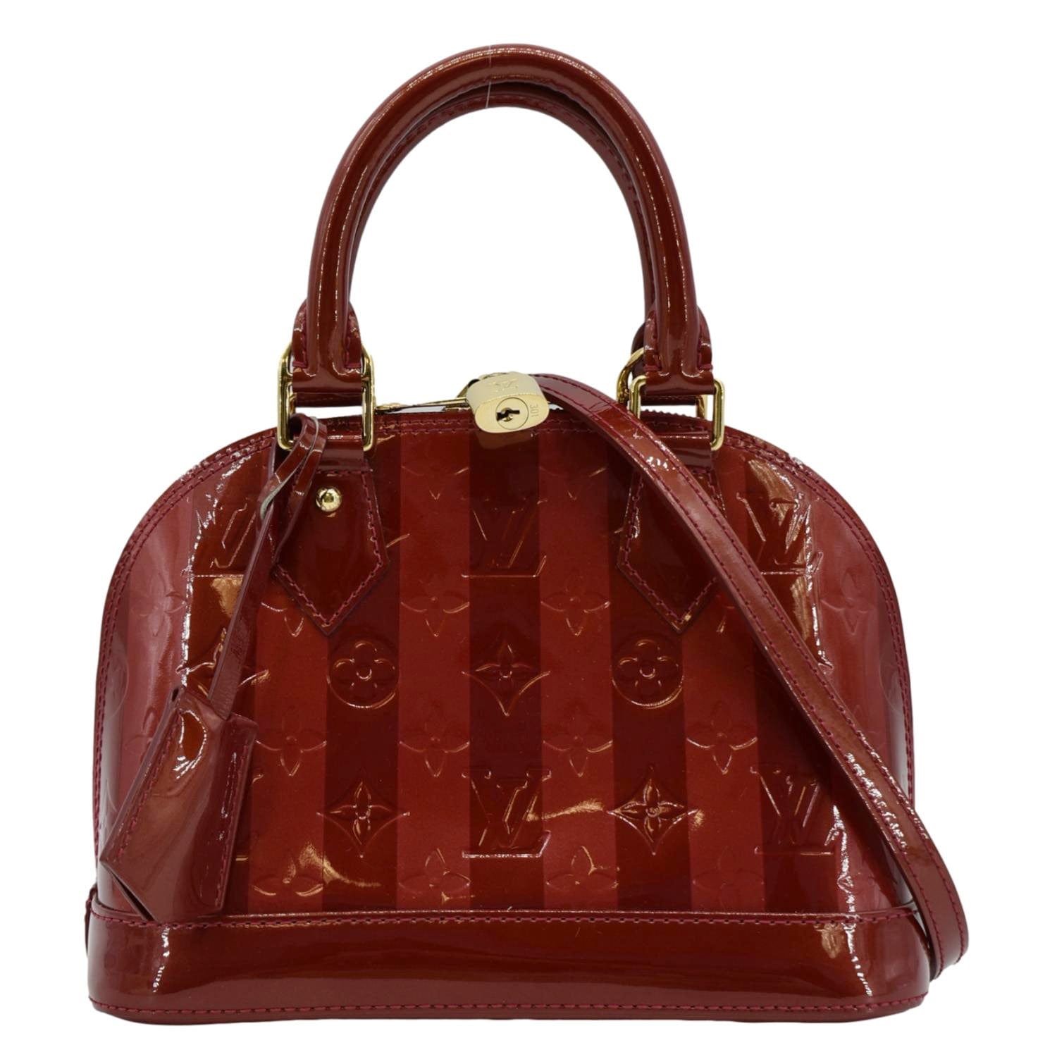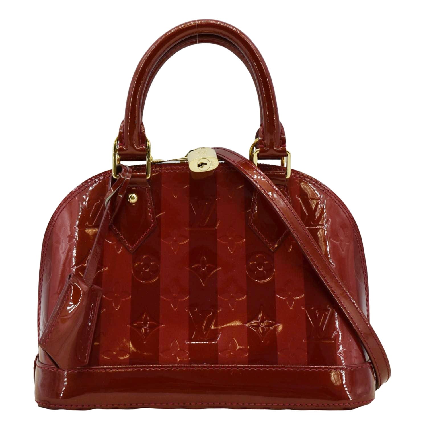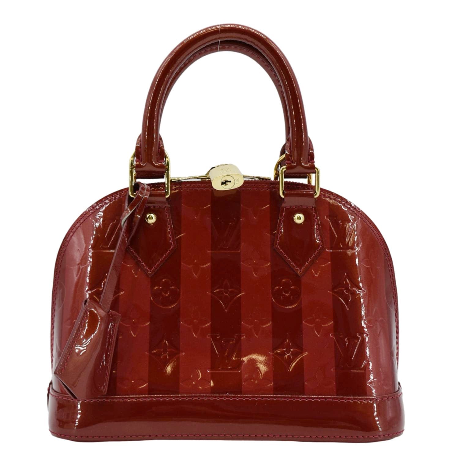 The LOUIS VUITTON Rayures Alma BB Vernis Leather Satchel Crossbody Bag in Pomme D'Amour showcases glossy red vernis leather with striped detailing. This elegant bag features gold-tone hardware and a removable shoulder strap for versatile carrying options.
