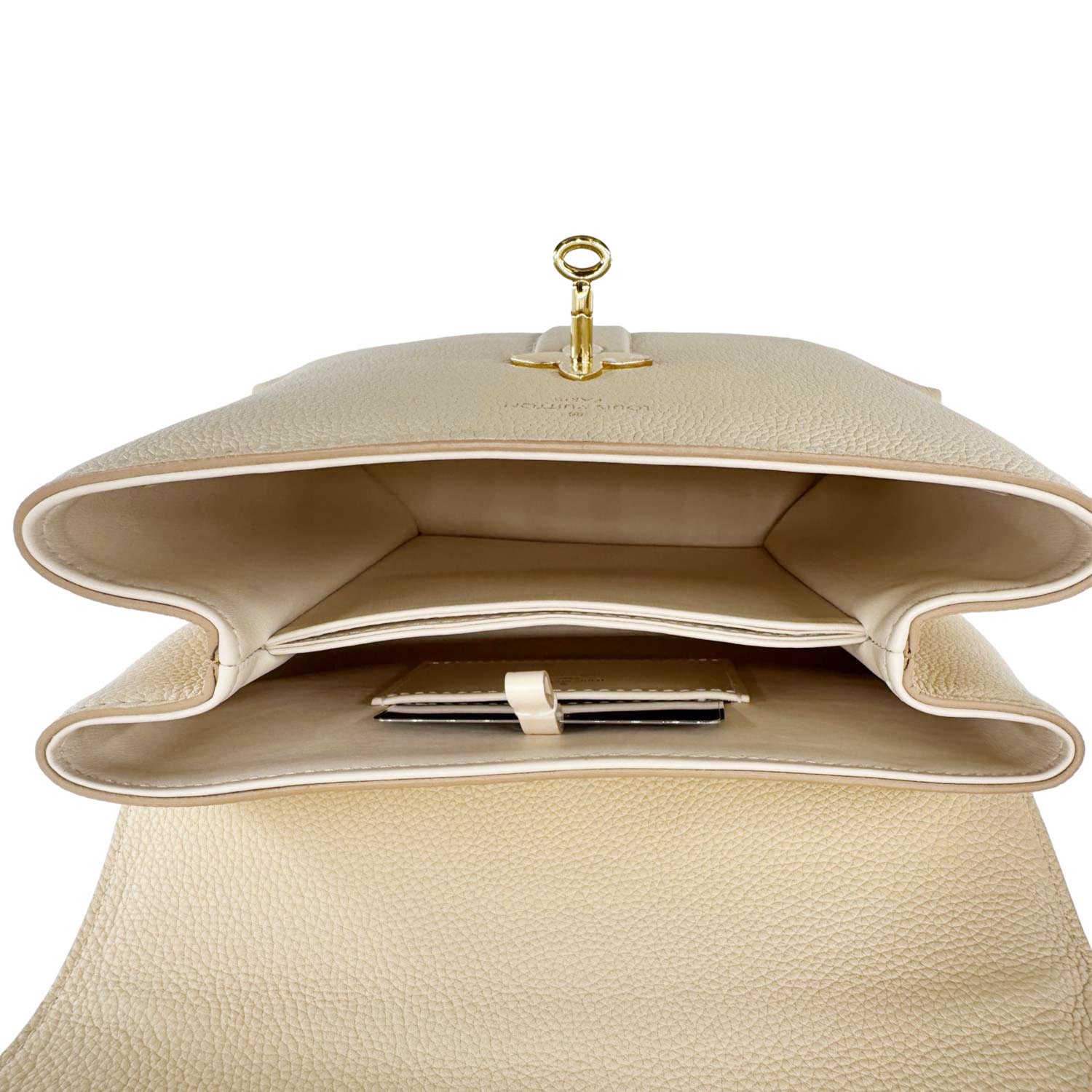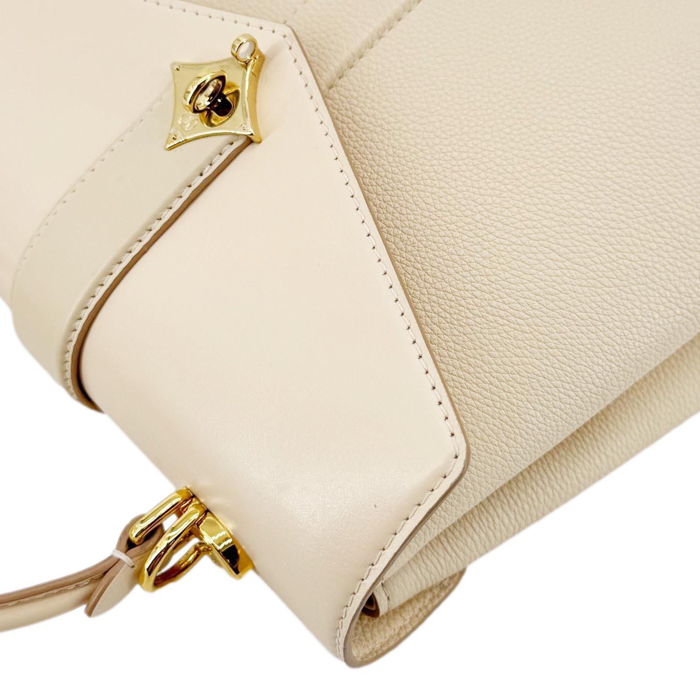 The Louis Vuitton Rose Des Vents PM is a refined top-handle bag crafted from grained leather in an elegant crème tone. Its structured shape, gold-tone hardware, and removable strap make it perfect for both hand-carry and crossbody wear.