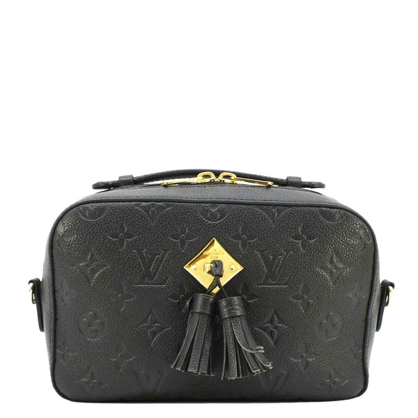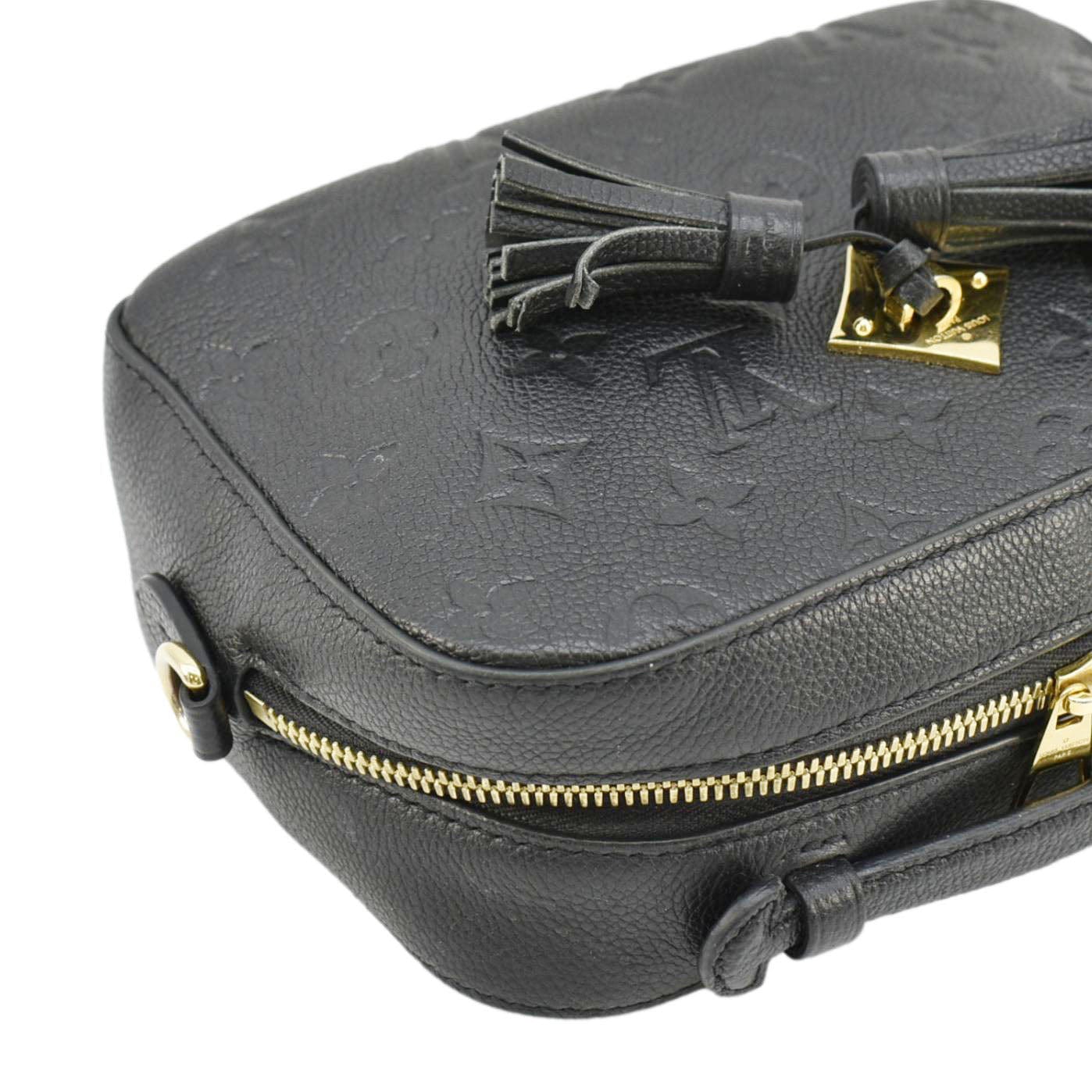 The Louis Vuitton Saintonge Satchel Bag in Black Monogram Empreinte Leather features a sleek top handle design with embossed monogram leather. Accented with gold-tone hardware and a playful tassel, it's a stylish and compact choice for everyday elegance.