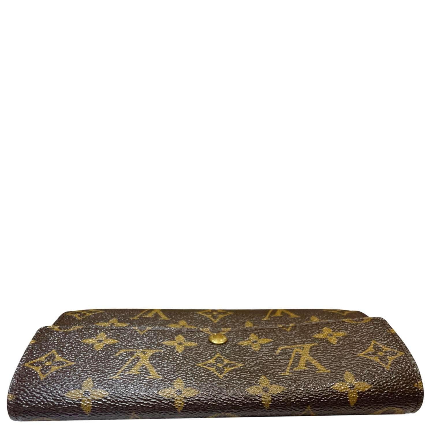 The LOUIS VUITTON Sarah Vintage Wallet in brown monogram canvas features a sleek, fold-over design with a snap closure. Spacious and practical, it offers multiple card slots and compartments for organization.