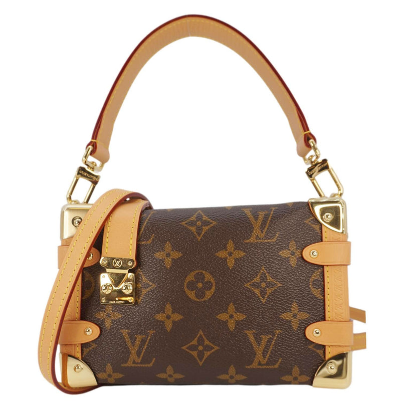 The LOUIS VUITTON Side Trunk PM Monogram Canvas Tote Shoulder Bag in brown features a compact, structured design with trunk-inspired details. Crafted from iconic Monogram canvas, it’s both chic and versatile.