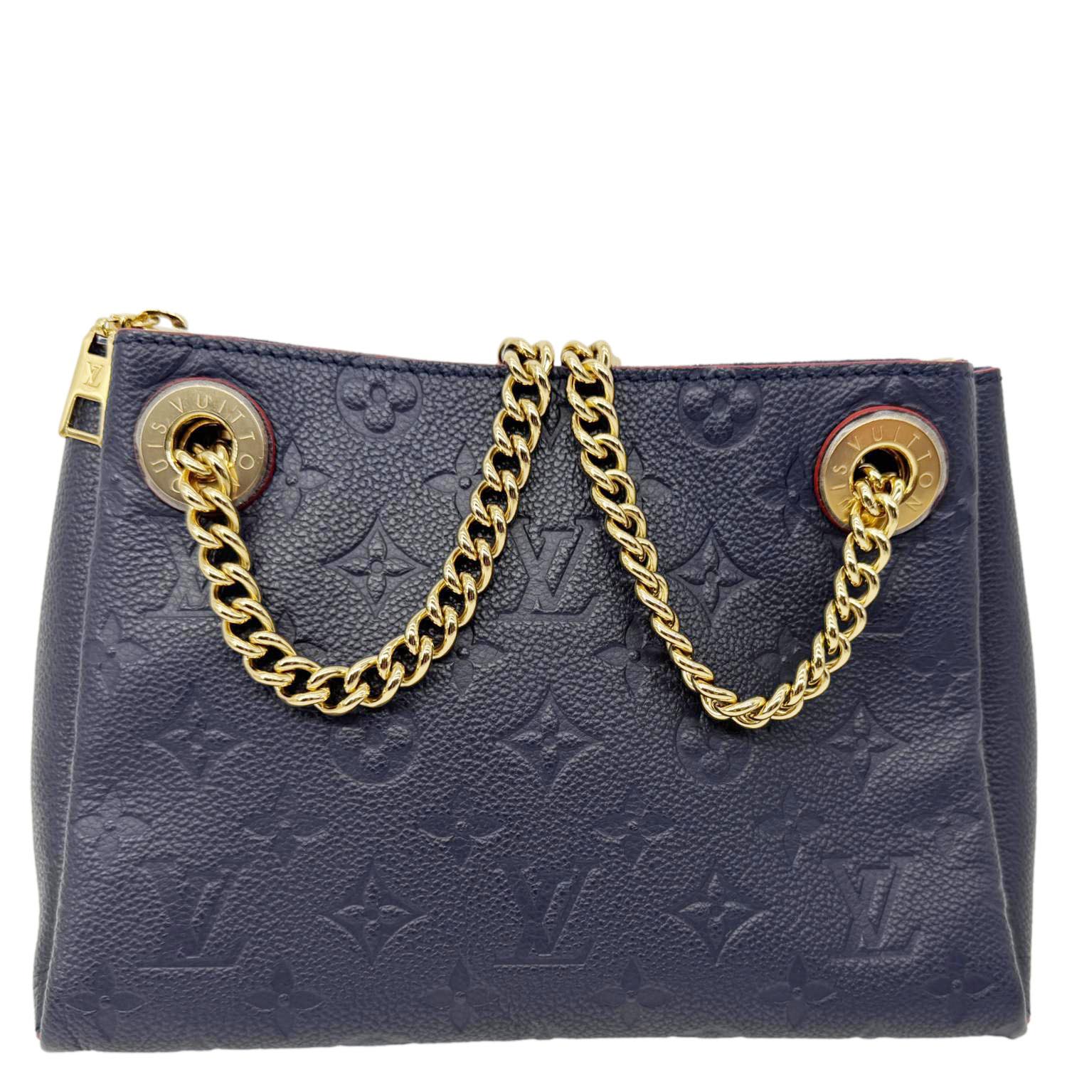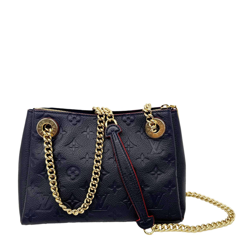 A chic and structured shoulder bag crafted from supple Monogram Empreinte leather in navy blue. The Surene BB features gold-tone chain straps with leather shoulder pads for comfort and a luxurious touch.