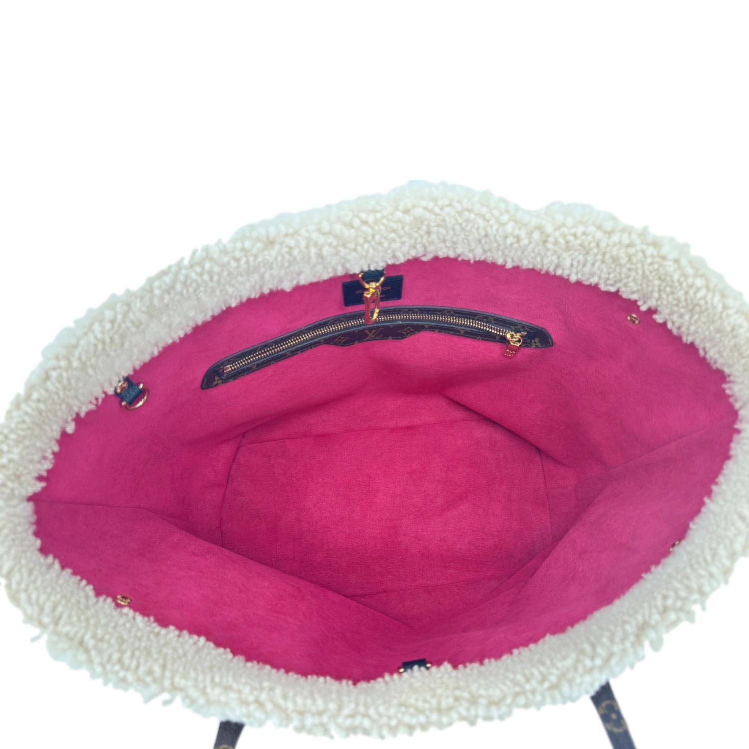 The Louis Vuitton Neverfull MM Monogram Teddy Shearling Shoulder Bag blends classic Monogram Canvas with cozy black shearling accents. Its plush texture and spacious silhouette make it a standout piece for luxury lovers.
