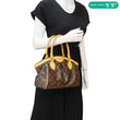 The Louis Vuitton Tivoli PM Satchel in brown Monogram canvas features a feminine, pleated design with gold-tone hardware. It is compact yet spacious and offers dual top handles and timeless elegance for everyday sophistication.