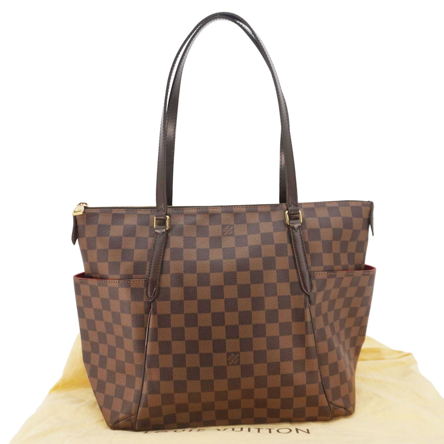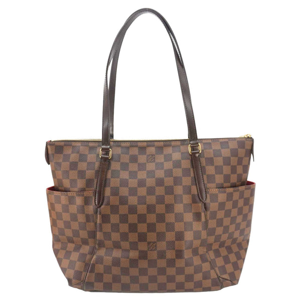 The Louis Vuitton Totally in Damier Ebene features a practical and spacious design, perfect for everyday use. Crafted from the signature Damier Ebene canvas, it includes comfortable leather shoulder straps, side pockets, and a zip closure for secure storage.