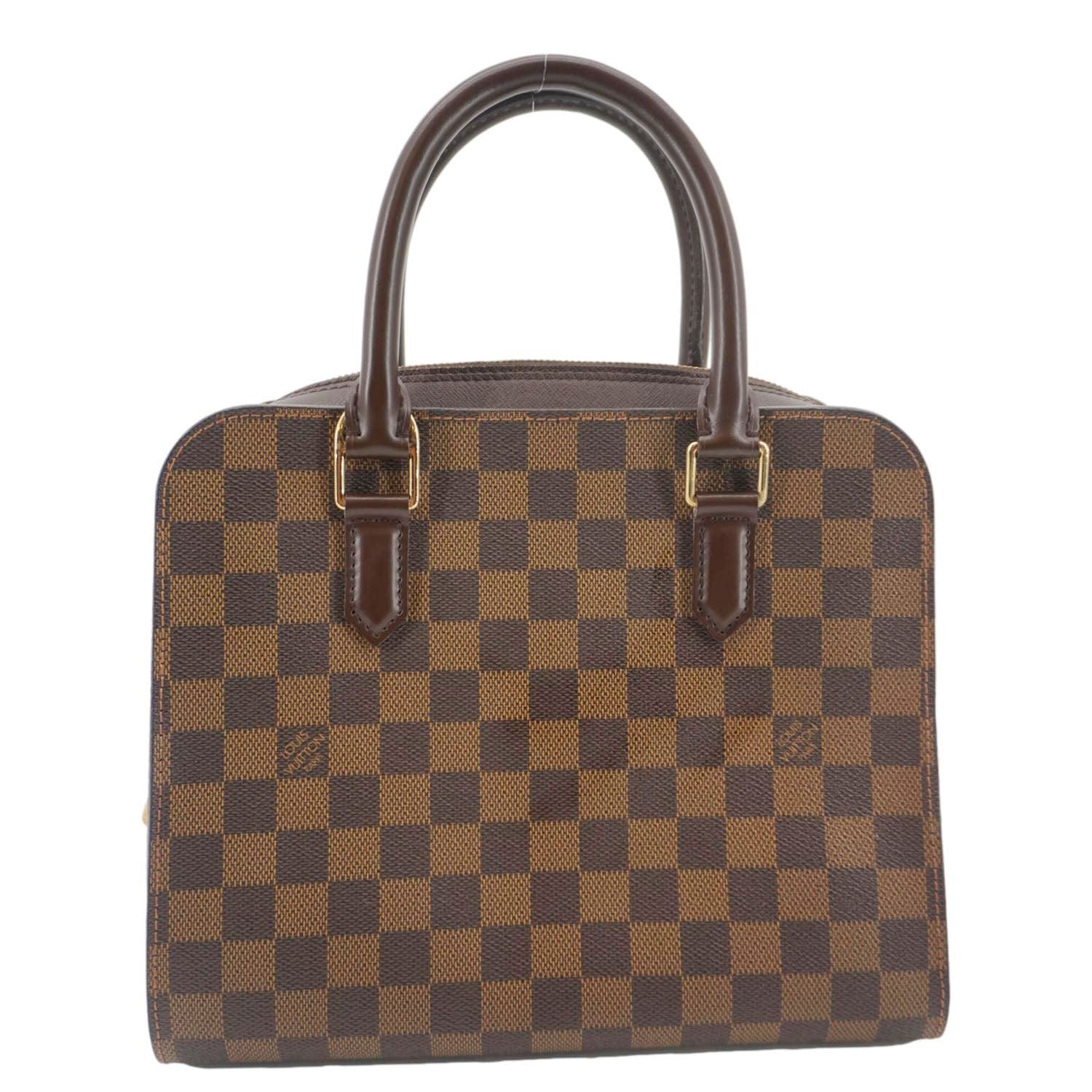 The Louis Vuitton Triana Satchel in Damier Ebene features a structured silhouette with the iconic checkerboard pattern. Elegant and practical, it offers a timeless look with ample space.