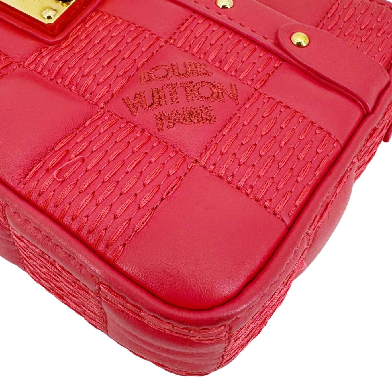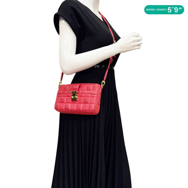 Louis Vuitton Troca PM in Damier lambskin leather features a boxy, structured silhouette with a chic pink hue. Its gold-tone hardware and signature quilting add a luxurious touch to this modern shoulder bag.
