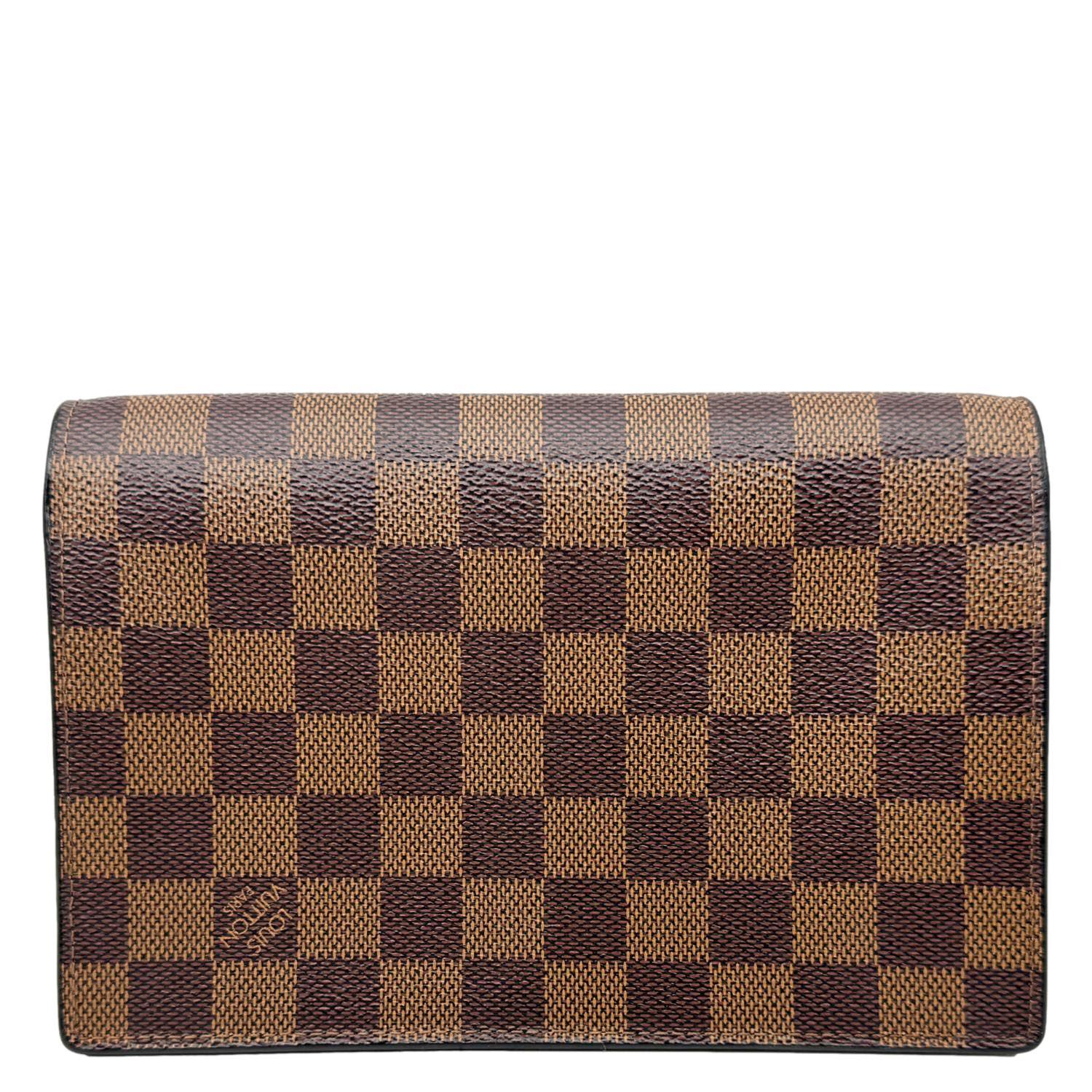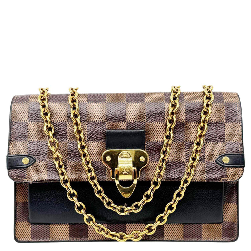 The LOUIS VUITTON Vavin PM in Damier Ebene is a chic crossbody bag with a structured silhouette and elegant gold-tone chain strap. Accented with smooth black leather and a signature clasp, it’s perfect for day-to-night sophistication.