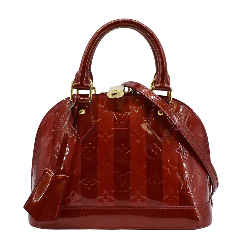 The LOUIS VUITTON Rayures Alma BB Vernis Leather Satchel Crossbody Bag in Pomme D'Amour showcases glossy red vernis leather with striped detailing. This elegant bag features gold-tone hardware and a removable shoulder strap for versatile carrying options.