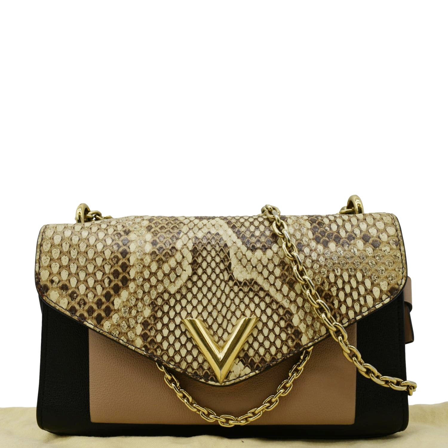 Make a bold statement with the "LOUIS VUITTON Very Python Leather Chain Crossbody Bag" in sleek Black, showcasing luxurious craftsmanship and modern elegance for a sophisticated touch to any ensemble.