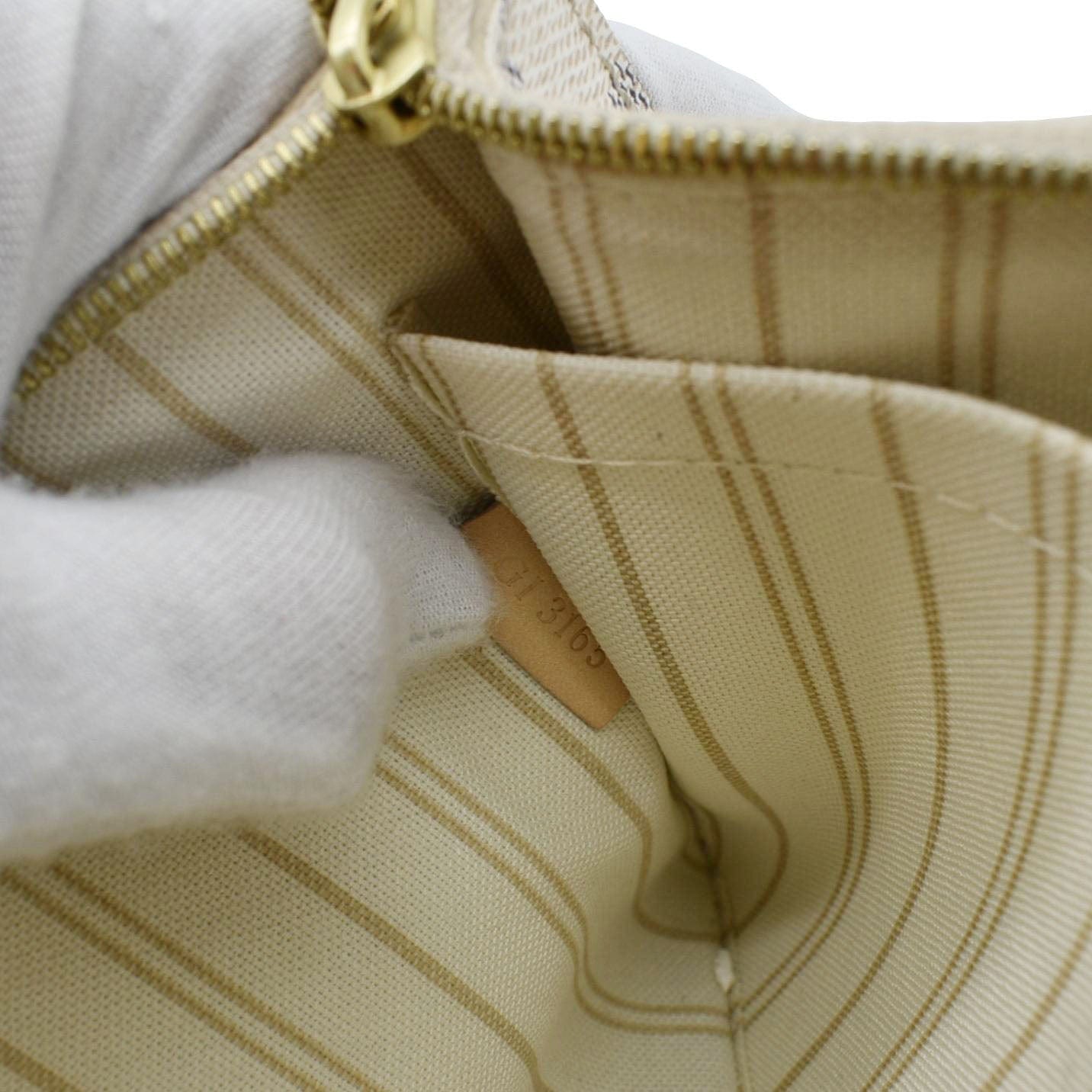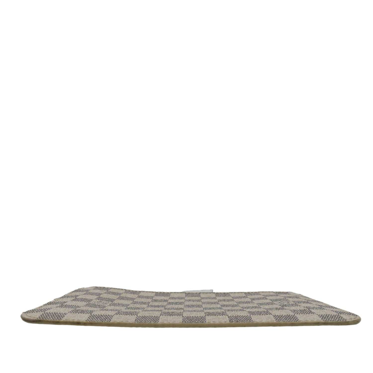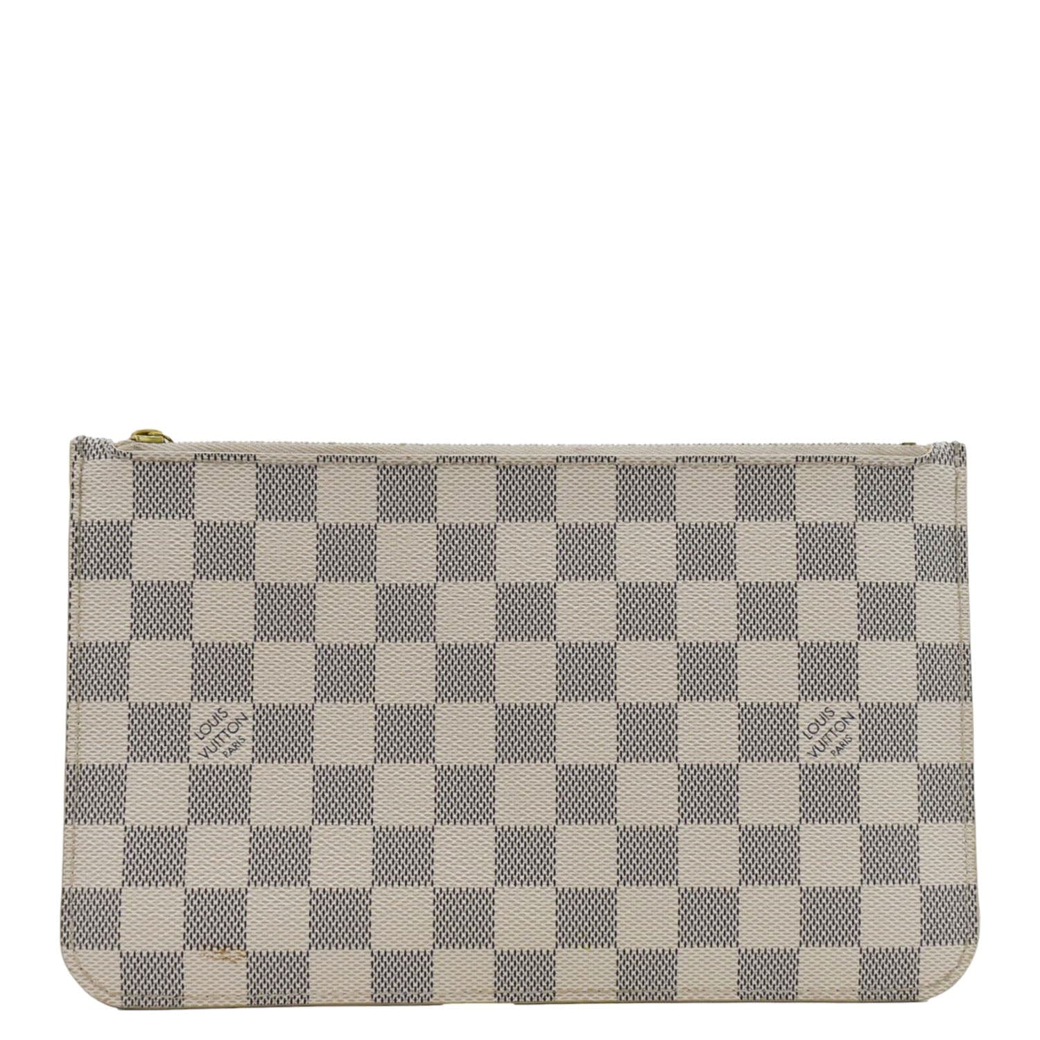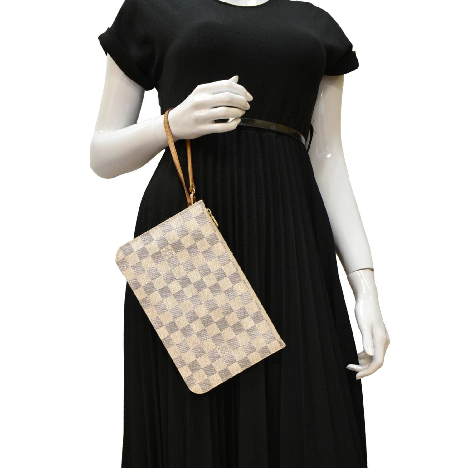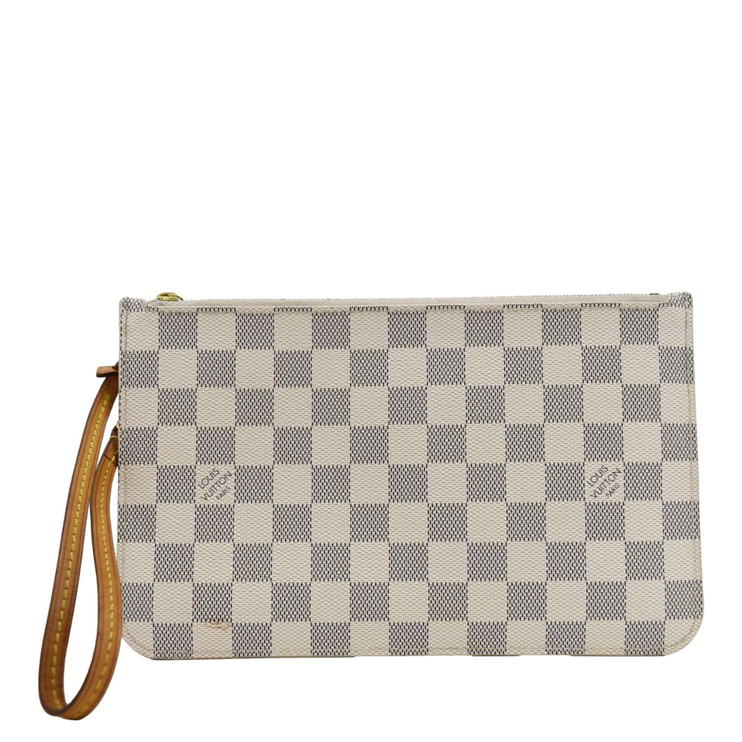 Elevate your ensemble with our LOUIS VUITTON Neverfull Damier Azur Pochette Wristlet Pouch in pristine white. Effortlessly blending style and functionality, it's the perfect accessory for a touch of luxury on the go.