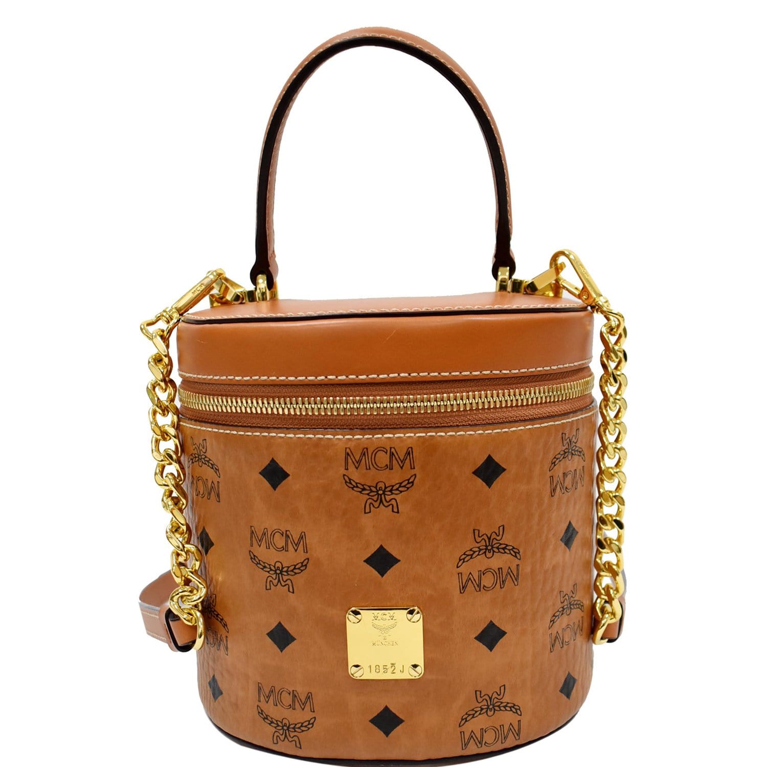 MCM Small Cylinder Visetos Monogram Leather Crossbody Bag Cognac