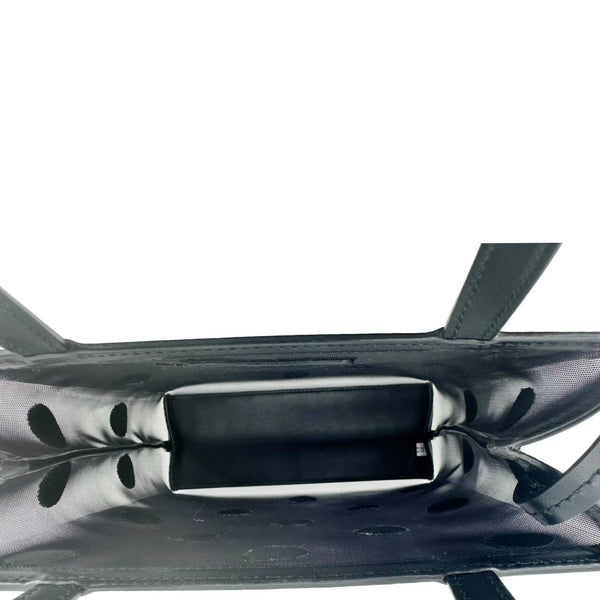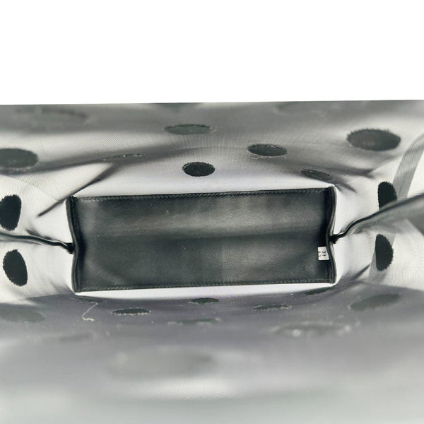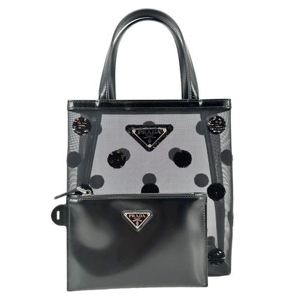 Prada Polka Dot Mesh Ricamo Rete Tote in Black showcases a stylish sheer mesh design with embroidered polka dots. The structured silhouette and dual handles give it a modern, high-fashion edge.