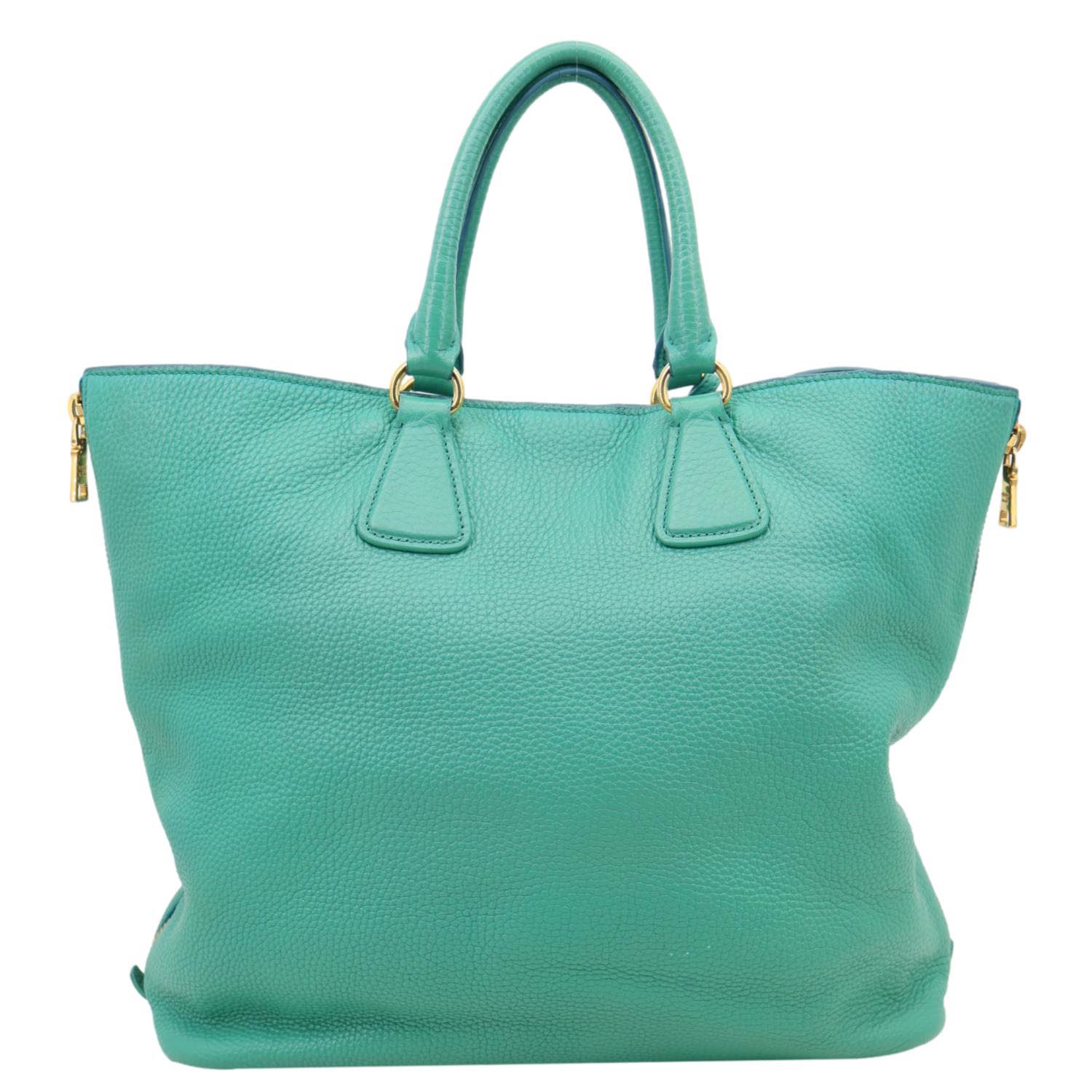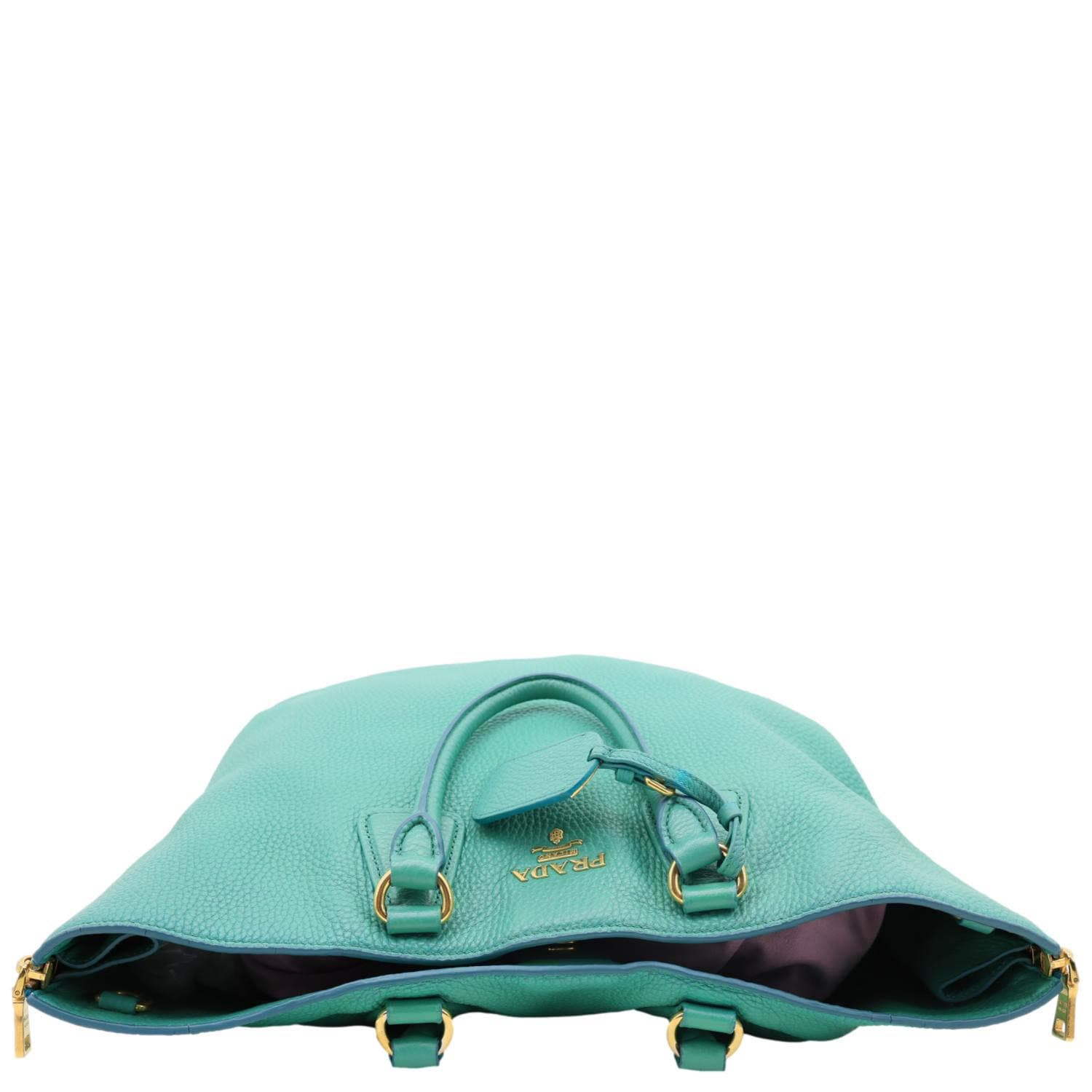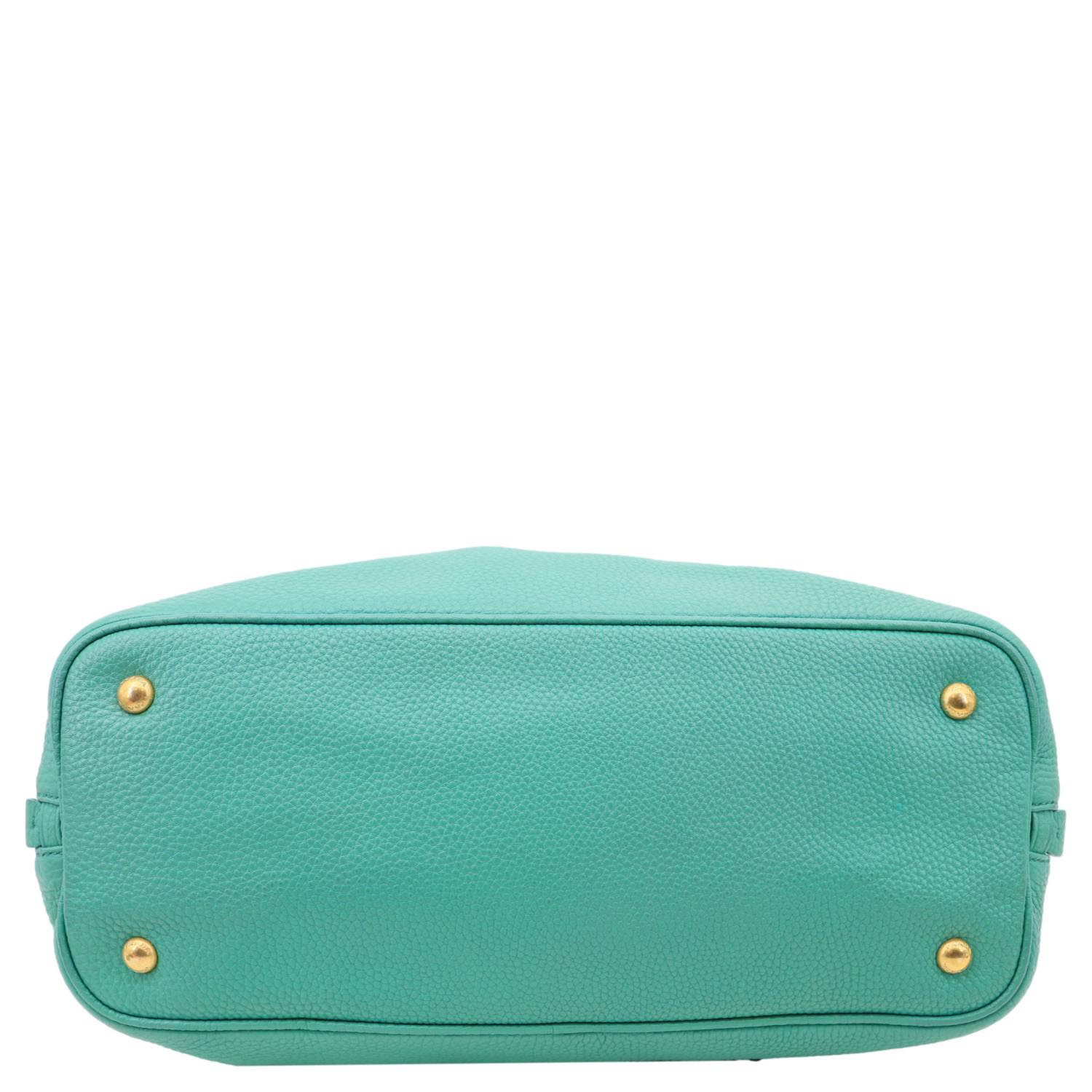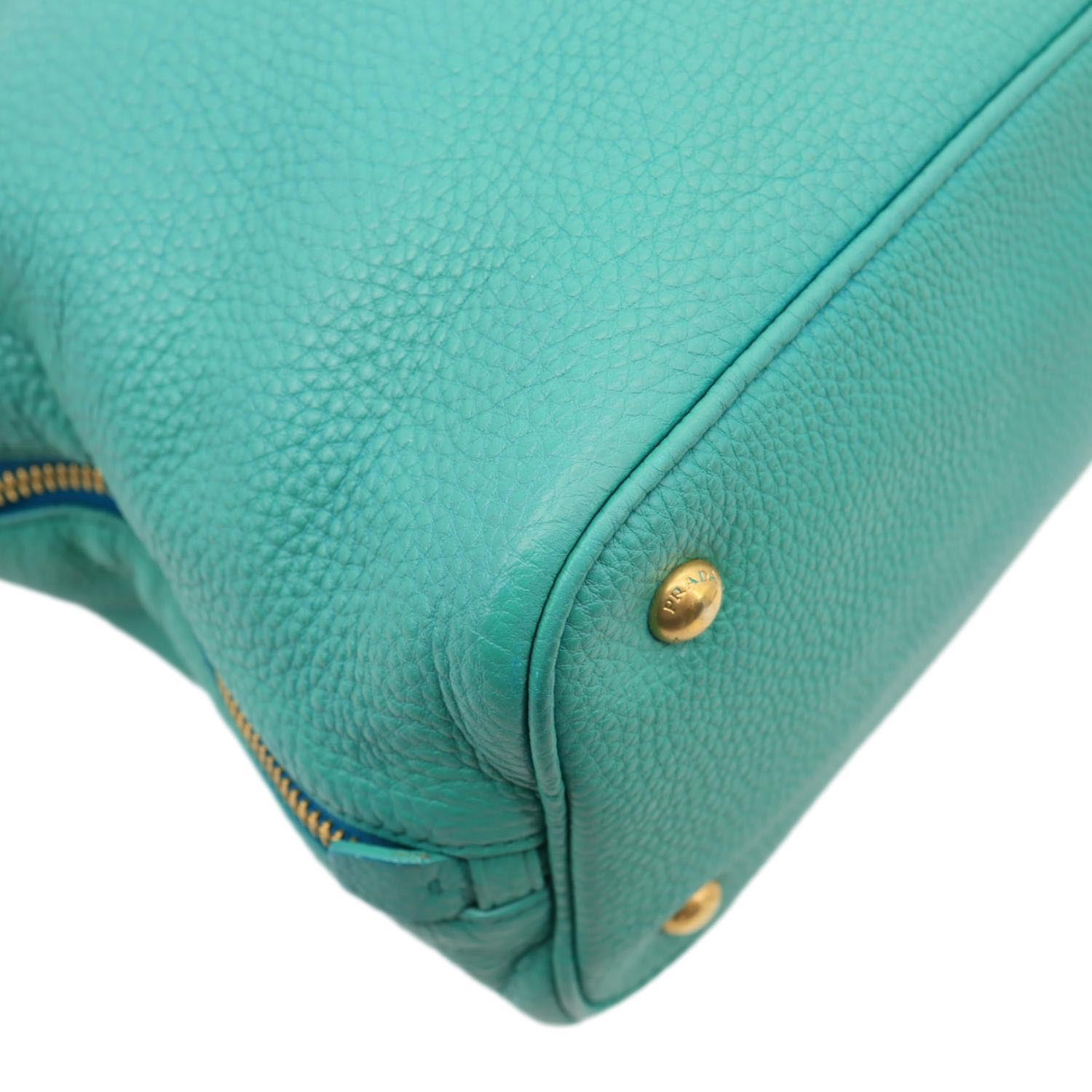 PRADA Vitello Daino Leather Shopping Tote Bag Blue features supple grained leather with a roomy interior and gold-tone hardware. A classic everyday tote with effortless elegance.