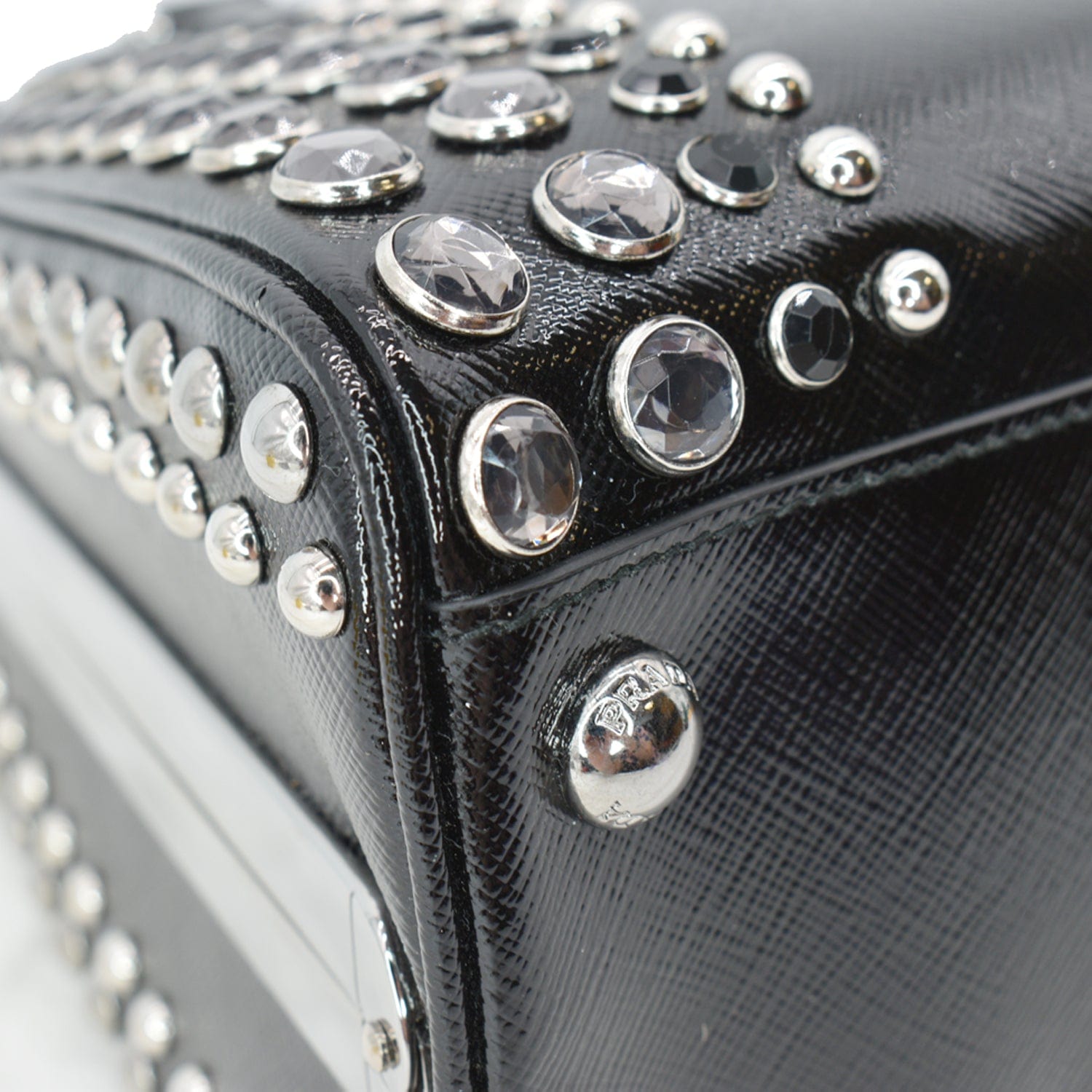 PRADA Vernice Crystal Small Frame Studded Saffiano Leather Top Handle Bag Black