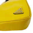 The Prada Triangle Clutch in yellow leather features a bold geometric shape with a sleek zip closure. Its modern design includes a detachable wrist strap for versatile carry.