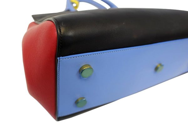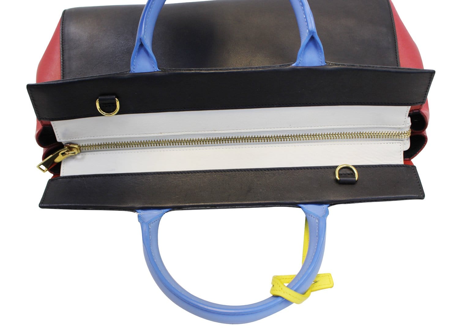 This chic handbag/tote is crafted of richly smooth calfskin leather in misty fog black. The bag features blue rolled leather top handles, red sides, and sewn anchors with a hanging silver classic YSL yellow clochette.