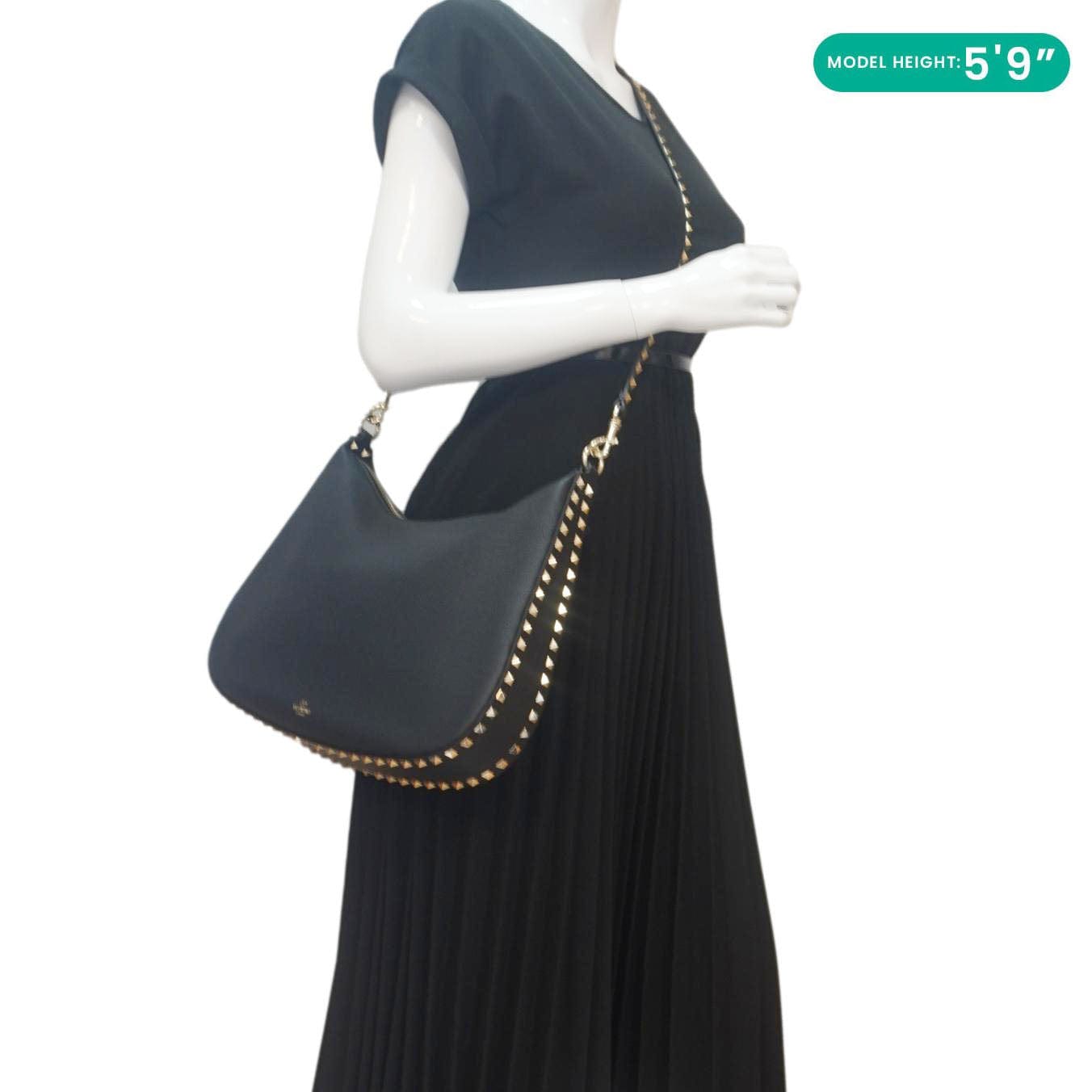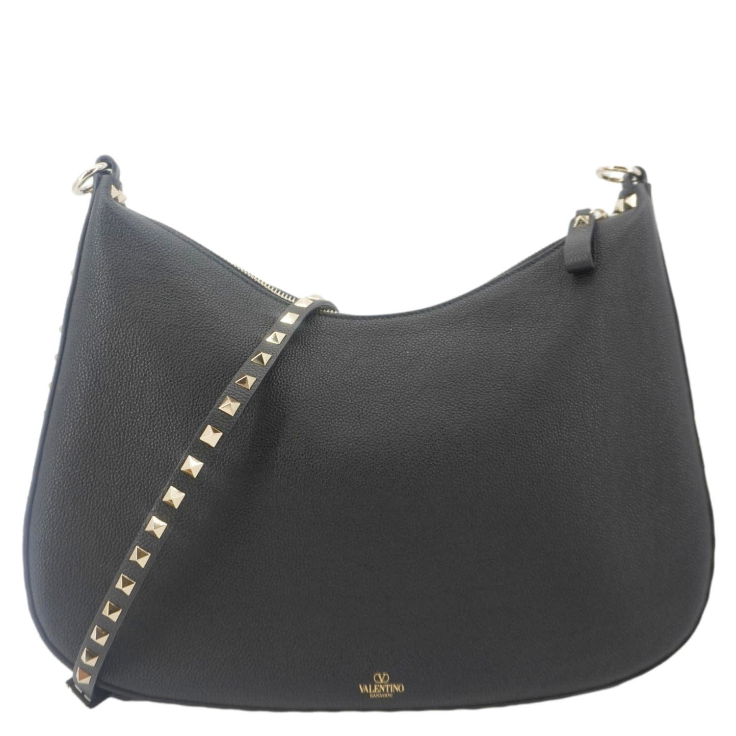 The Valentino Garavani Rockstud hobo bag in black leather features the brand’s signature pyramid studs, a slouchy silhouette, and a spacious interior, combining elegance with everyday practicality.