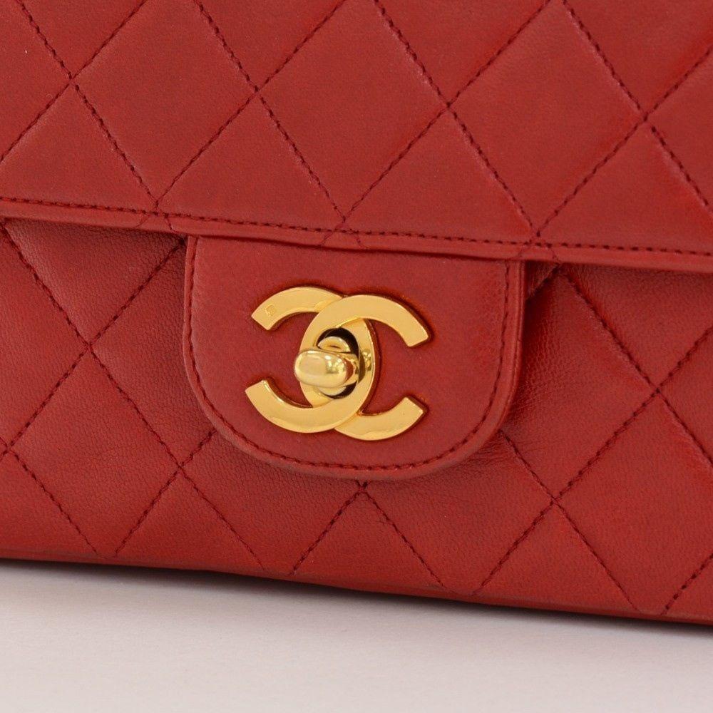 Authentic Chanel red quilted leather bag with double flap. It has CC twist lock on the front flap. Second flap has stud closure. Underneath it, there is one slip in pocket and inside lining is in famous Chanel red leather. One interior open pocket is split into 3 compartments. Brass chain winded with leather can be carried as shoulder bag with double or single chain. Very rare, cute and stylish item.