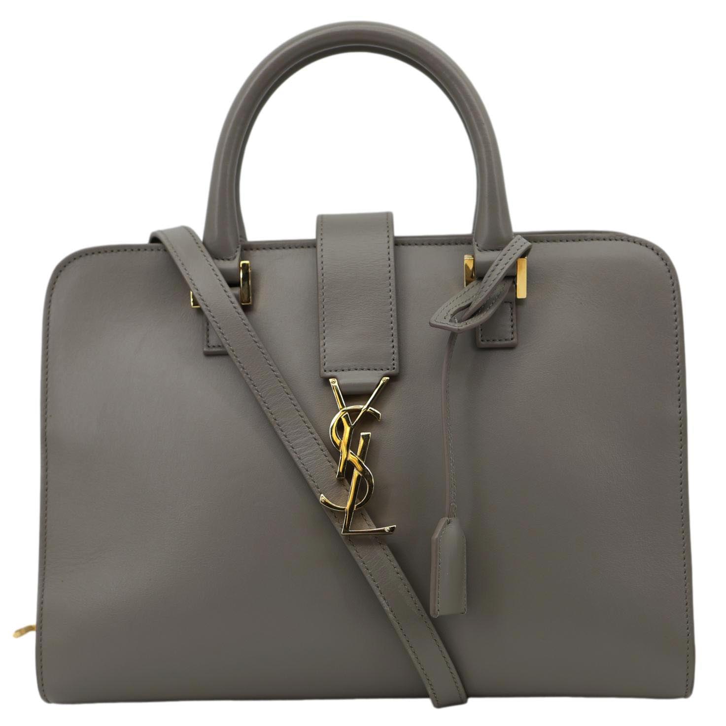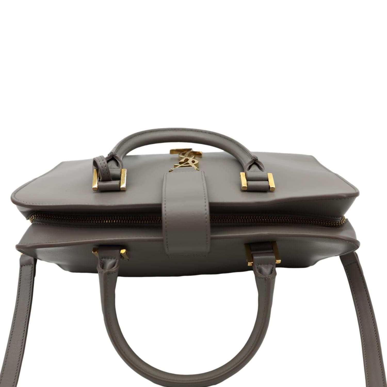 The YVES SAINT LAURENT Cabas Baby Tote in gray leather features a sleek, structured silhouette with a gold-tone YSL charm and top handles. Its detachable strap adds versatility for shoulder or crossbody wear.