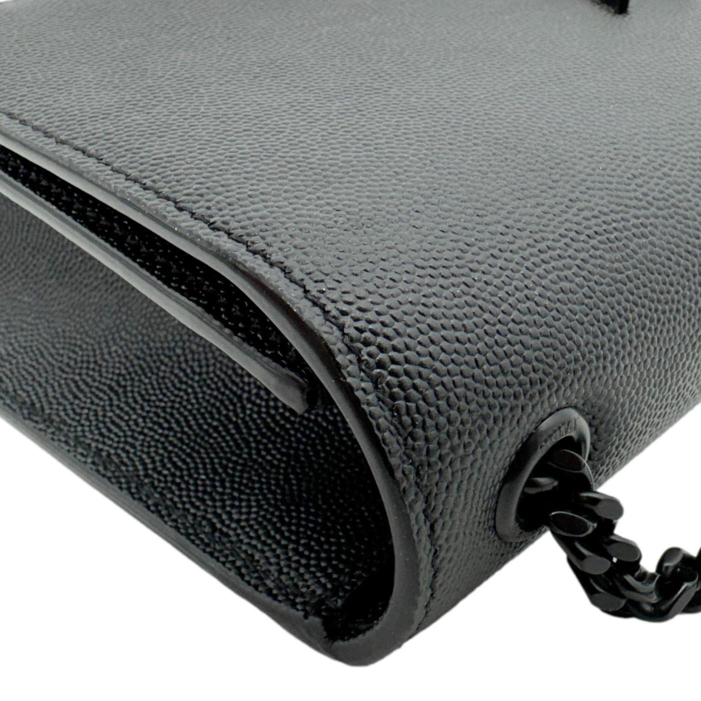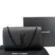 The YVES SAINT LAURENT Kate Small Crossbody Bag in Black Grain de Poudre leather features a structured silhouette with a sleek, pebbled finish. Accented by the iconic YSL logo and a chain strap, it’s perfect for elegant day-to-night styling.