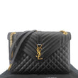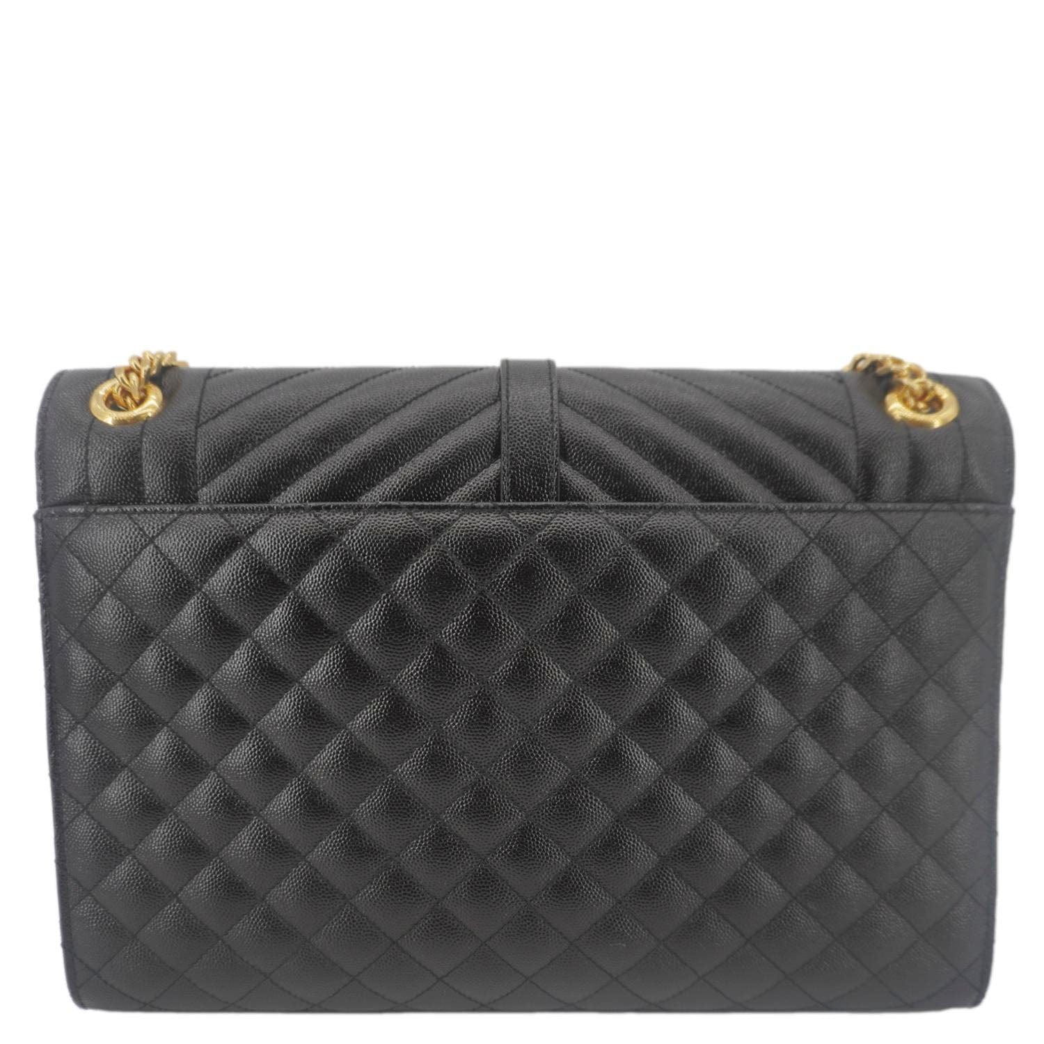 The Yves Saint Laurent Envelope Flap Chain Shoulder Bag in Black Leather is a timeless and sophisticated piece. Featuring a chevron-quilted design, signature YSL logo, and a sliding chain strap, it offers versatile styling with classic elegance.