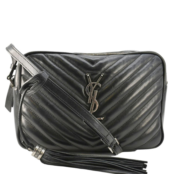 The YVES SAINT LAURENT Lou Camera Bag in black features chevron-quilted leather, the iconic YSL logo in silver-tone hardware, and a tassel accent. Stylish and versatile, it's perfect for day-to-night wear.