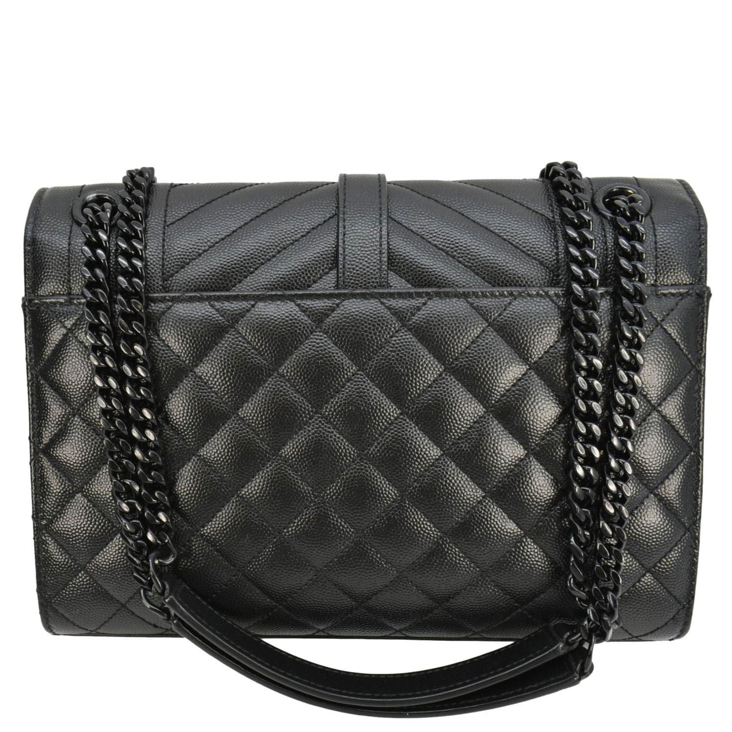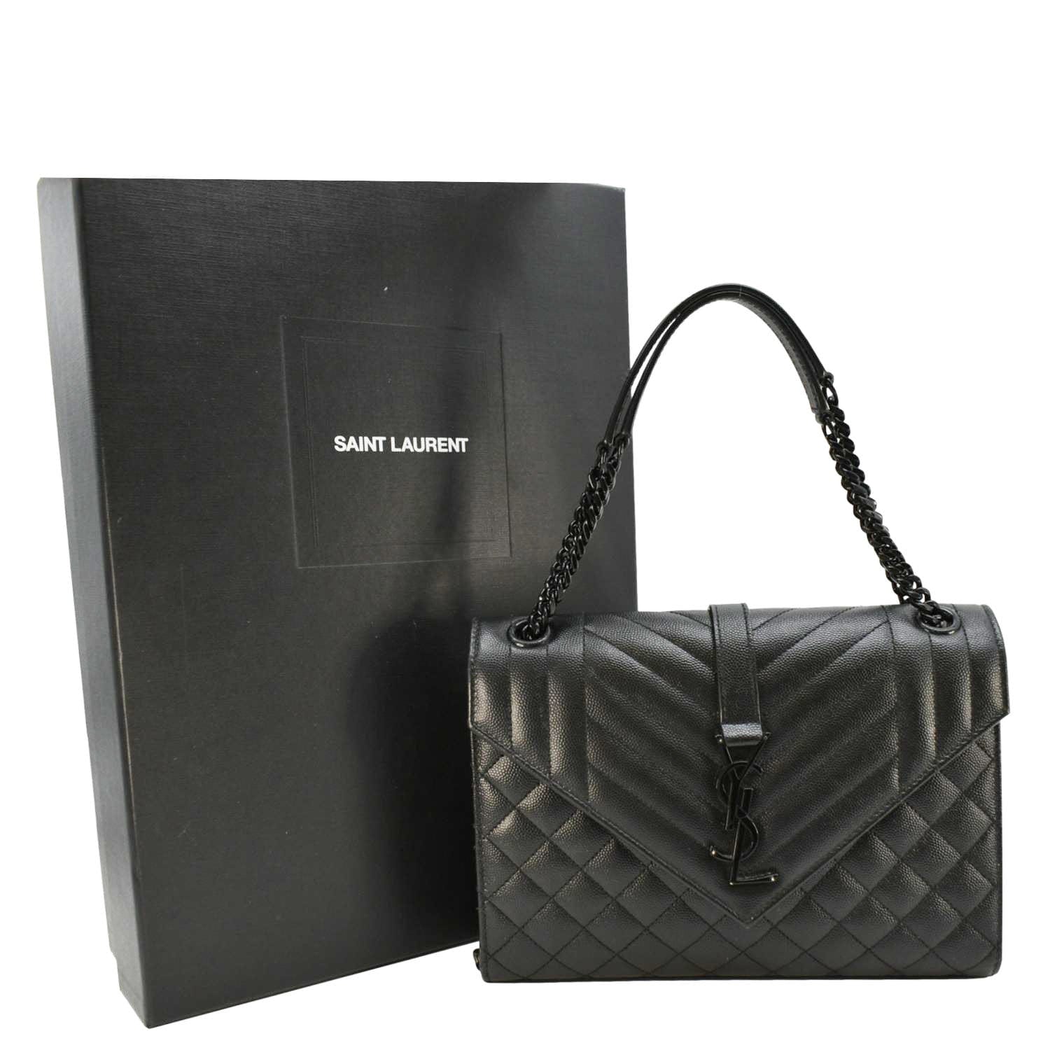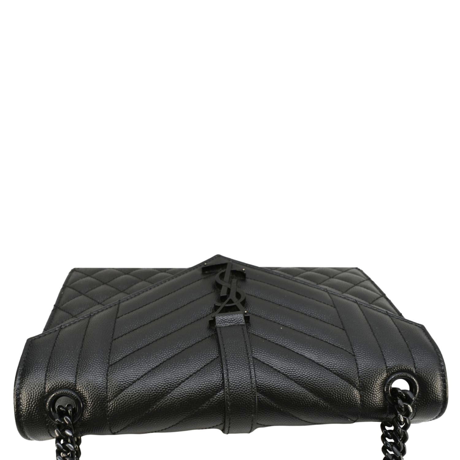 The YVES SAINT LAURENT Envelope Medium Mixed Matelassé Leather Shoulder Bag in Black features a luxurious blend of quilted leather patterns. This sophisticated shoulder bag offers a sleek design with a chain strap and iconic YSL logo, perfect for elevating any outfit.
