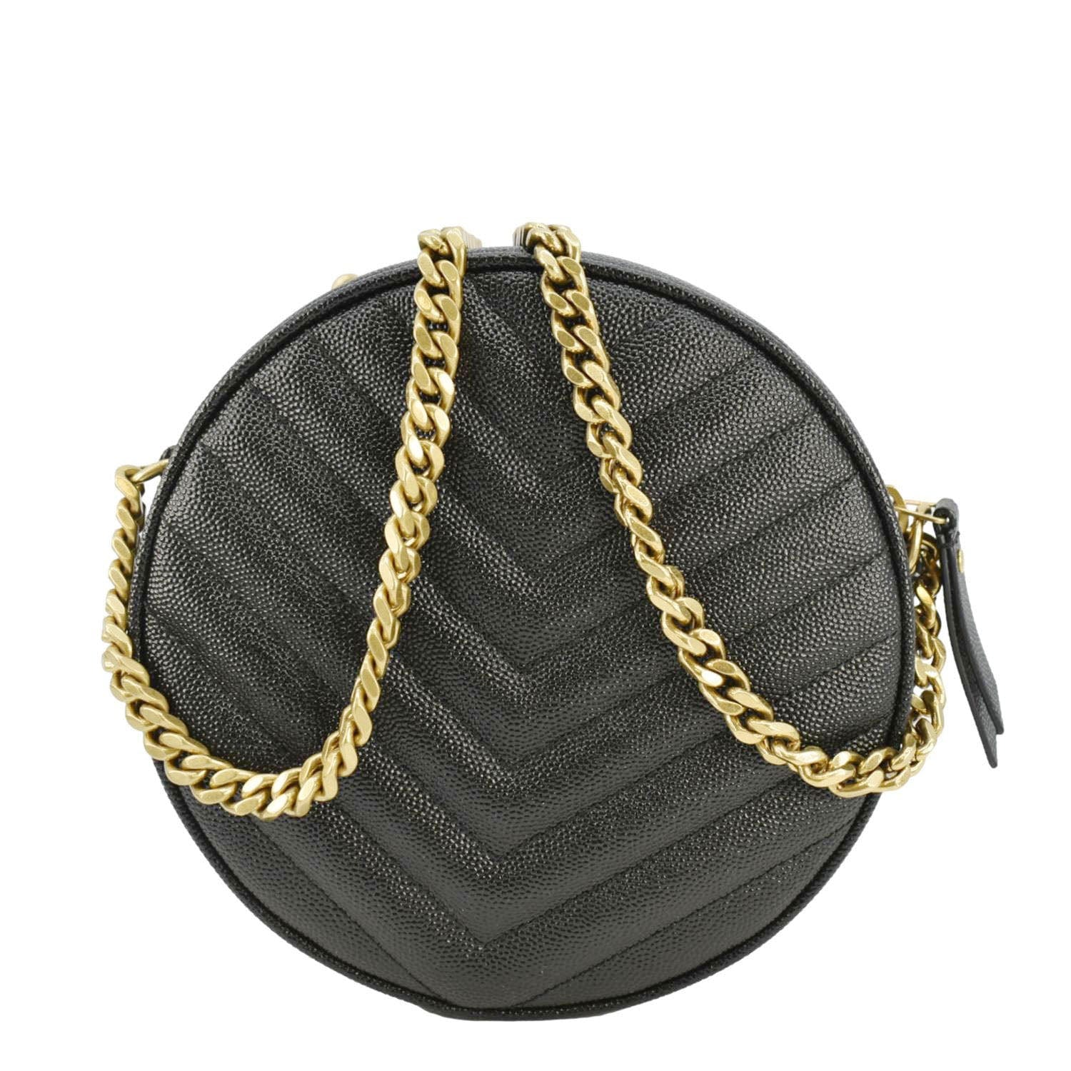 The YVES SAINT LAURENT Vinyle Round Camera Crossbody Bag in black chevron-quilted leather features a sleek, circular design with the iconic YSL logo. This compact bag offers a stylish, modern look, perfect for carrying essentials with elegance.