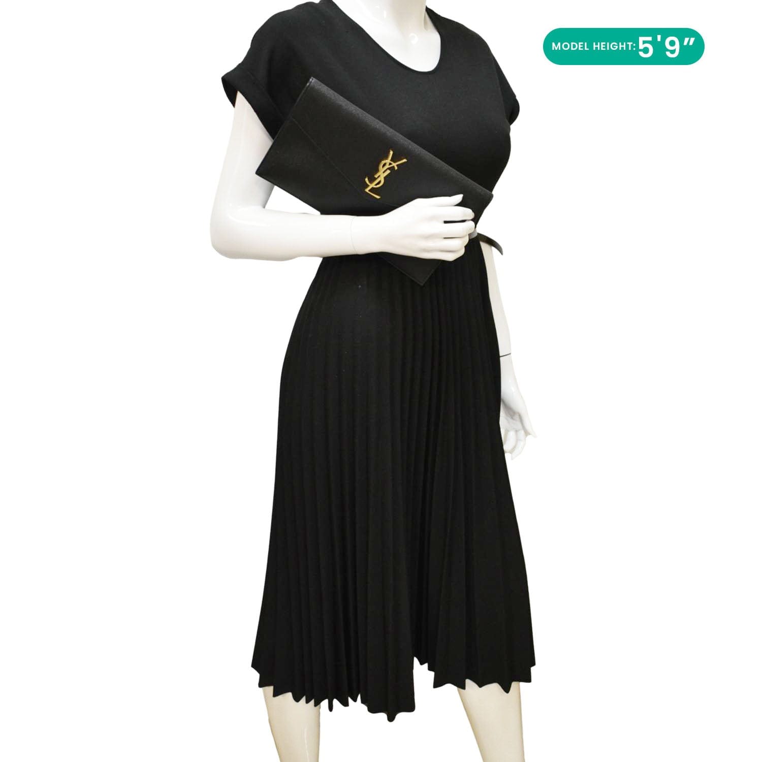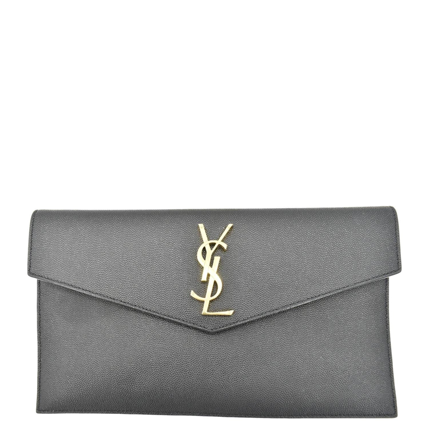 The YVES SAINT LAURENT Uptown Envelope Clutch in Grain De Poudre Leather features a sleek black design with a refined texture and a gold-tone YSL logo. This elegant accessory offers a timeless look, perfect for sophisticated, minimalist styling.
