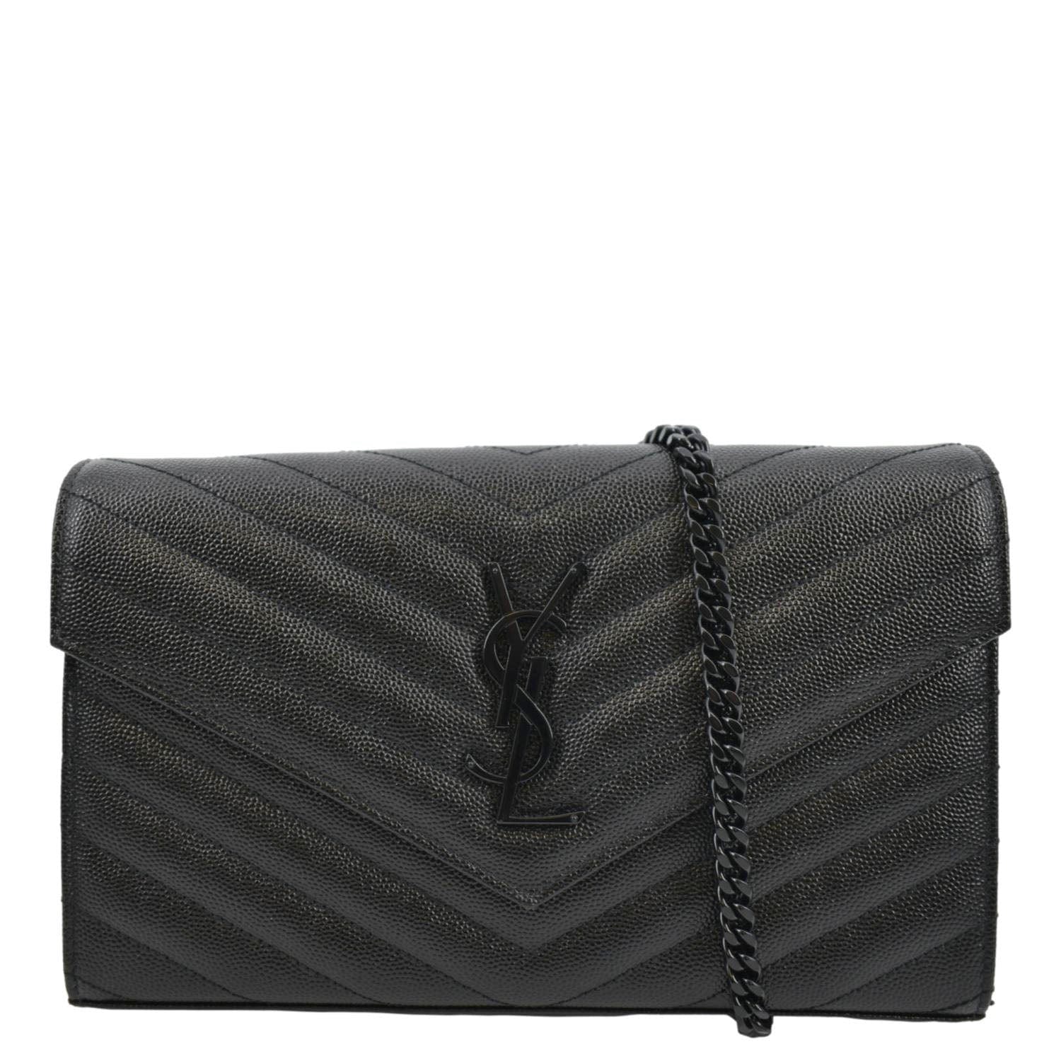 Elevate your style with the YVES SAINT LAURENT Wallet Leather Crossbody Bag in Black. This luxury handbag exudes sophistication, featuring premium leather and the iconic YSL monogram emblem. Its versatile design makes it a perfect day-to-night accessory, and the chain strap adds a touch of glam.